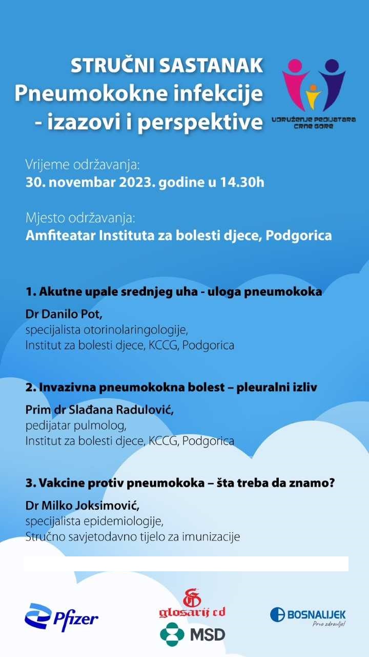 Sa zadovoljstvom vas pozivamo da prisustvujete Stručnom sastanku "Pneumokokne infekcije - izazovi i perspektive" u organizaciji Udruženja pedijatara Crne Gore koji će se održati 30.11.2023 godine u 14.30h u Amfiteatru Instituta za bolesti djece, KCCG.